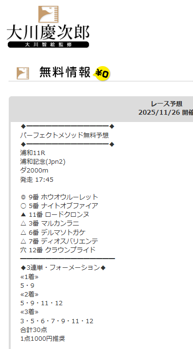 当日に競馬リポートさんに紹介されて無料情報から試してみました、JBC開催日だったから重賞買い目が良かったな~なんて思いながら指定通り12点、1点千円で馬券購入しました。