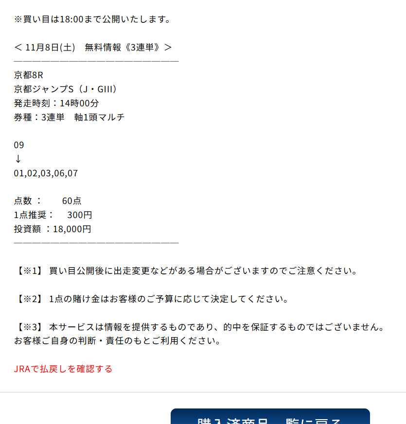 今朝、オススメされた初めだし無料情報から試してみようと思い 公開されていた3連単買い目を推奨通りに馬券購入。 そしたら初回から3連単万馬券(309.6倍)的中いただけました! ビックリしましたがオススメする理由が無料予想からも理解できました。 1点500円で馬券を購入していたので15万4800円! 明日はマイルチャンピオンの予想公開されるみたいなので楽しみに買い目公開を待ちたいと思います。 先週もエリザベス女王杯3連単予想で7万4040円的中させていたのもうなずけます。